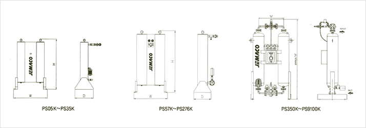 257.62 | ⓐ처리유량은 입구압력 7kg/㎠G, 38℃ 입구온도 -40℃ 이슬점(PDP) 기준이며, 최대상용압력은 9.9kg/㎠G임. ⓐ(-73.3℃ 이슬점은 선택사양이며 처리유량은 표준사양 × 0.8임) ⓑ드라이어 중량은 흡착제를 제외한 것이며, PS900K이상 모델은 공장 출하시 흡착제를 드라이어에 채우지 않고 별도 공급함. ⓒPS350K~PS5820K는 한국산업안전공단 승인 제품이며, ASME 승인품으로 공급 가능함. |
